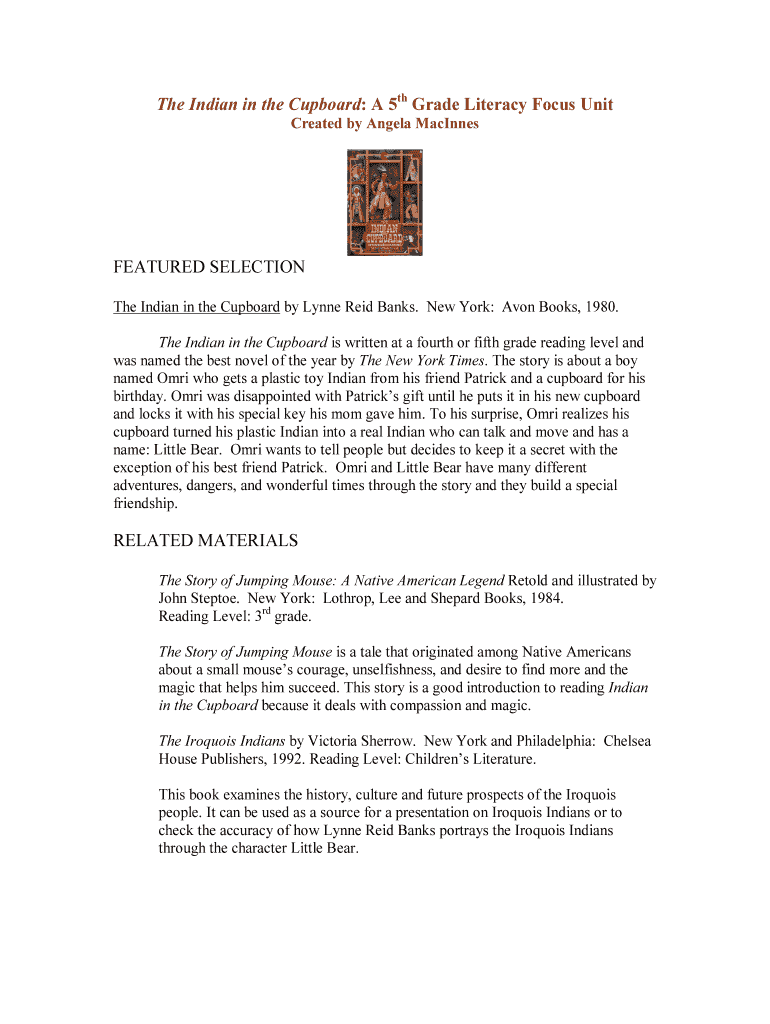 The TheIndianintheCupboard:A5 GradeLiteracyFocusUnit CreatedbyAngelaMacInnes FEATUREDSELECTION TheIndianintheCupboardby LynneReidBanks. New York:Cookbooks,1980. The Indian in the Cupboardiswrittenatafourthorfifthgradereadingleveland