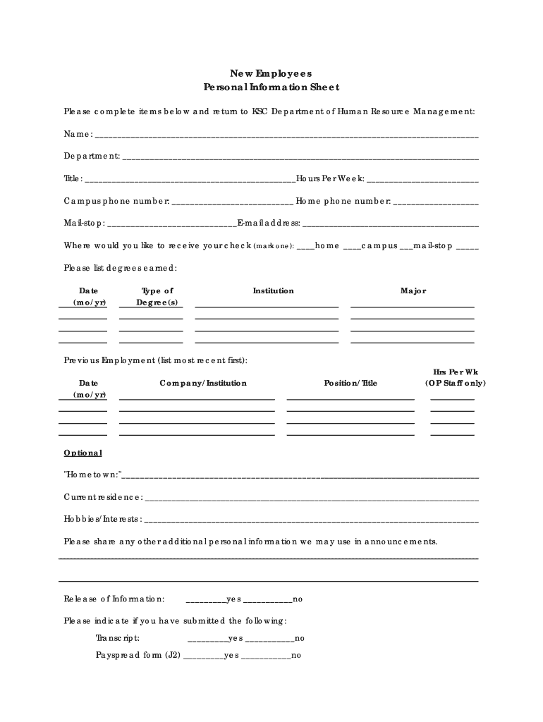 New Employees Personal Information Sheet Please complete items below and return to KSC Department of Human Resource Management: Name: Department: Title: Hours Per Week: Campus phone number: Home phone