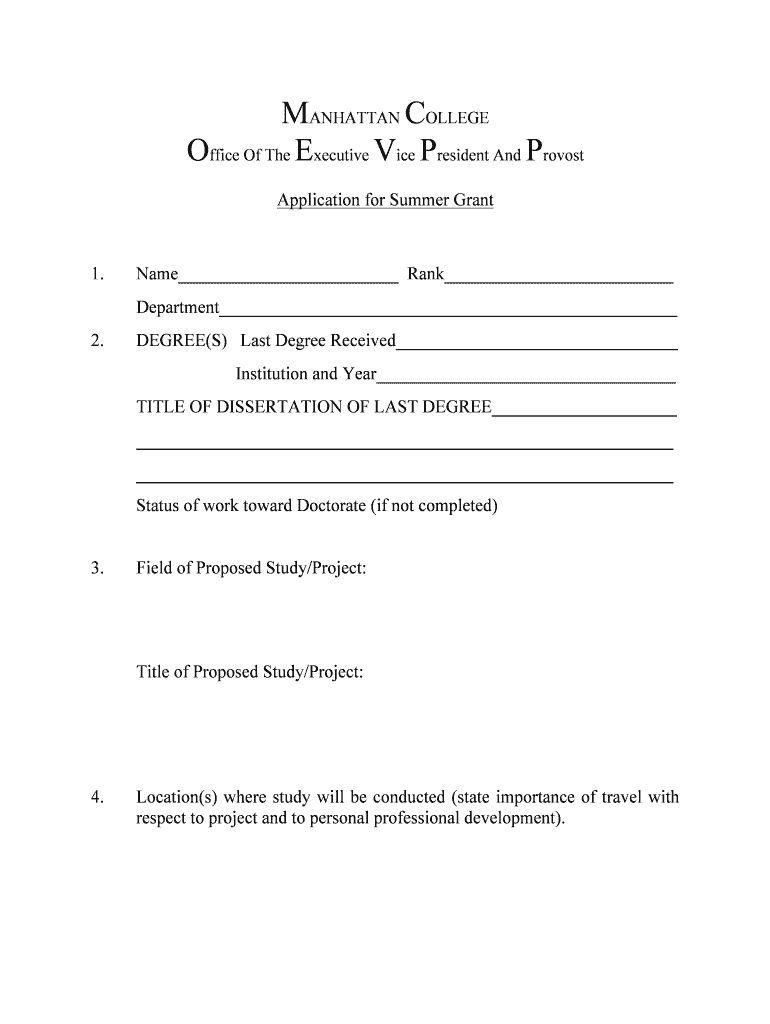 MANHATTAN COLLEGE Office Of The Executive Vice President And Provost Application for Summer Grant 1. Name Rank Department 2. DEGREE(S) Last Degree Received Institution and Year TITLE OF DISSERTATION