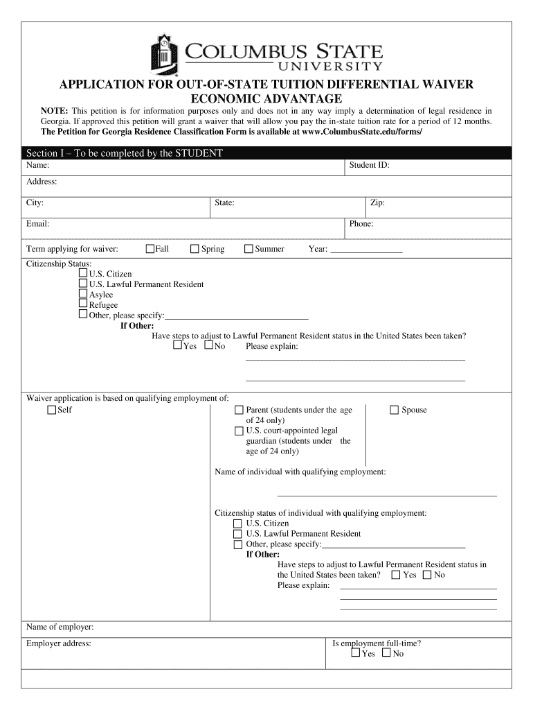 APPLICATION FOR OUTOFSTATE TUITION DIFFERENTIAL WAIVER ECONOMIC ADVANTAGE NOTE: This petition is for information purposes only and does not in any way imply a determination of legal residence in Georgia.
