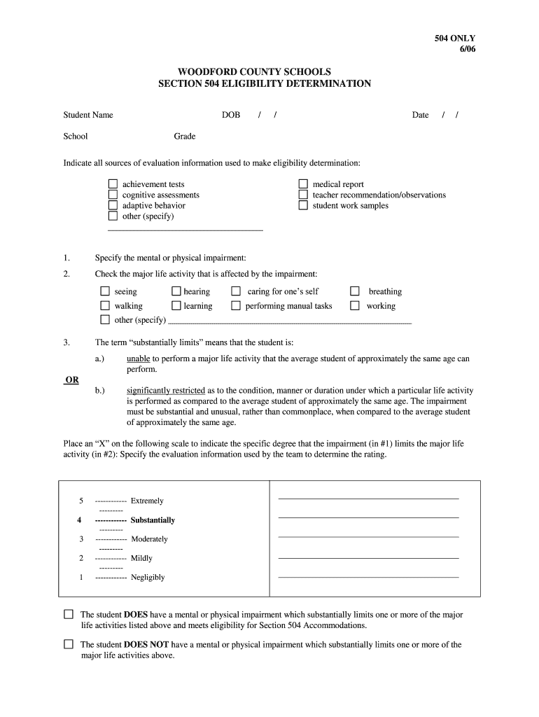 504 ONLY 6/06 WOODFORD COUNTY SCHOOLS SECTION 504 ELIGIBILITY DETERMINATION Student Name DOB School / / Date / / Grade Indicate all sources of evaluation information used to make eligibility determination: