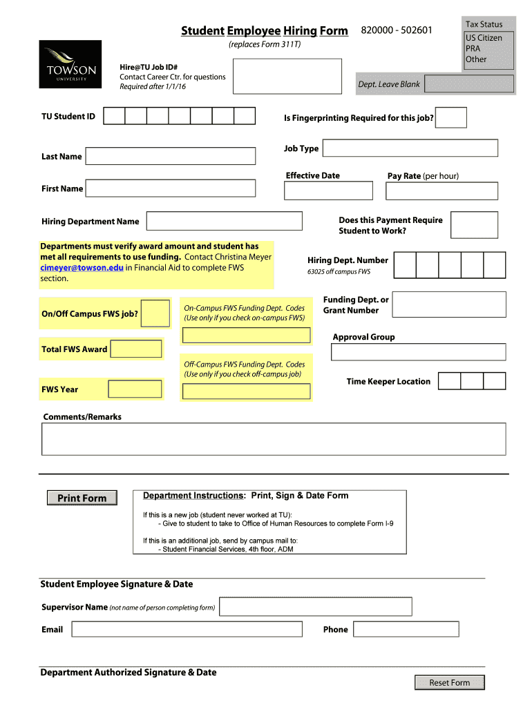Student Employee Hiring Form 820000 502601 (replaces Form 311T) Hire TU Job ID# Contact Career Ctr. For questions Required after 1/1/16 TU Student ID Tax Status US Citizen PRA Other Dept. Leave Blank