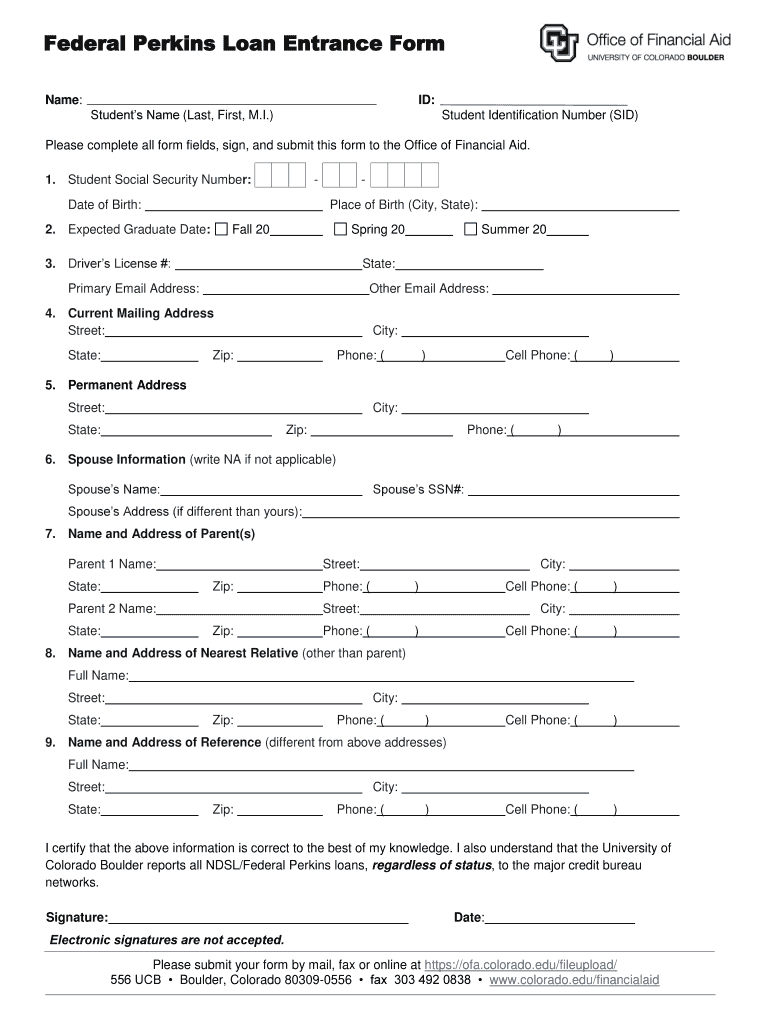 Get the free Federal Perkins Loan Entrance Form - colorado