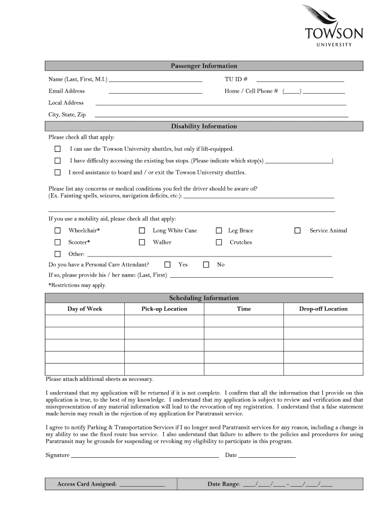 Passenger Information Name (Last, First, M.I.) TU ID # Email Address Home / Cell Phone # () Local Address City, State, Zip Disability Information Please check all that apply: I can use the Towson