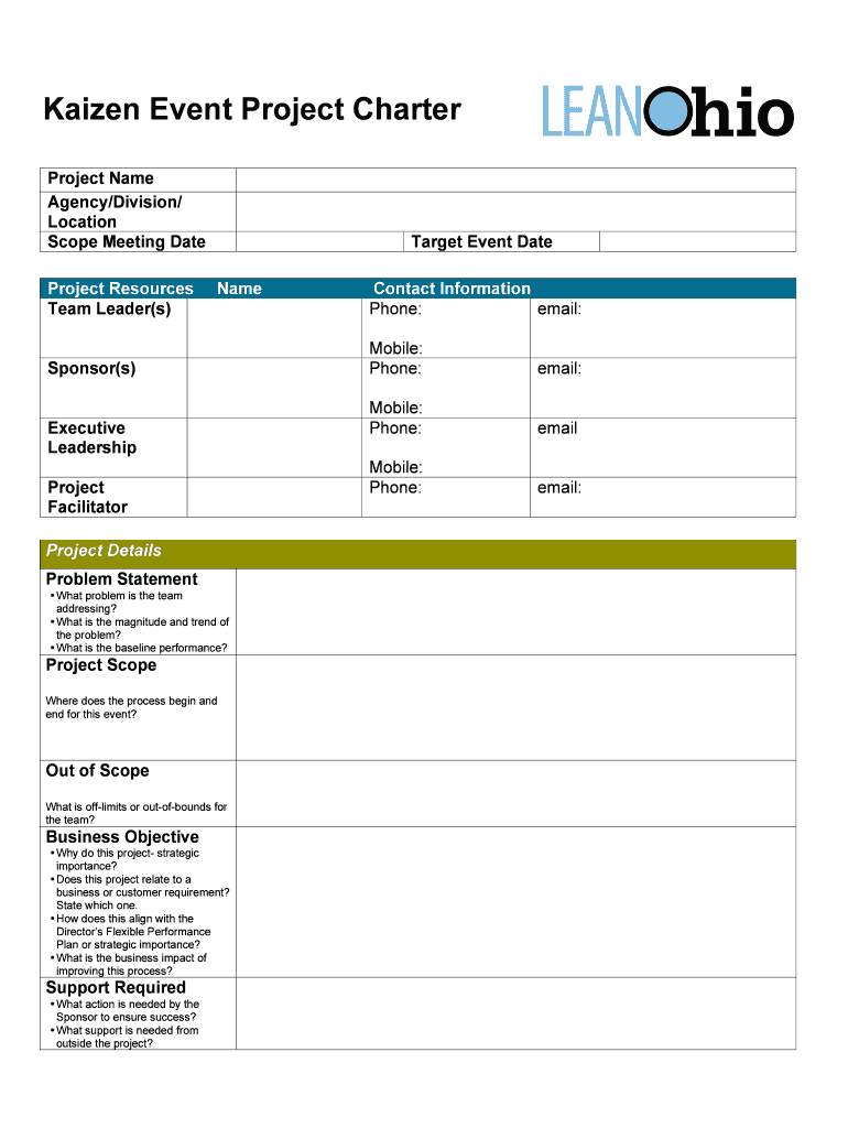 Organizations seeking continuous improvement: Kaizen is a philosophy that emphasizes continuous improvement in all areas of an organization. Therefore, any organization looking to implement kaizen principles can benefit from a project charter.