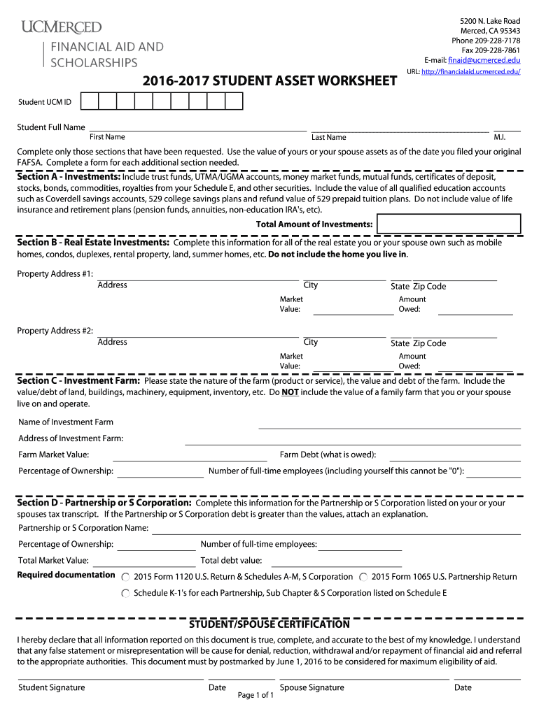 5200 N. Lake Road Merced, CA 95343 Phone 2092287178 Fax 2092287861 Email: fin aid coerced.edu 20162017 STUDENT ASSET WORKSHEET URL: http://financialaid.ucmerced.edu/ Student UCM ID Student Full Name