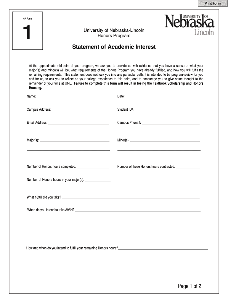 Print Form HP Form: 1 University of Nebraska Lincoln Honors Program Statement of Academic Interest At the approximate midpoint of your program, we ask you to provide us with evidence that you have