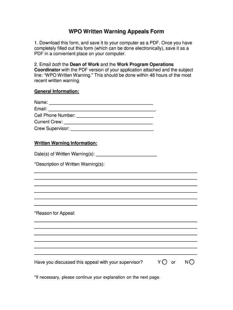 WHO Written Warning Appeals Form 1. Download this form, and save it to your computer as a PDF. Once you have completely filled out this form (which can be done electronically), save it as a PDF in
