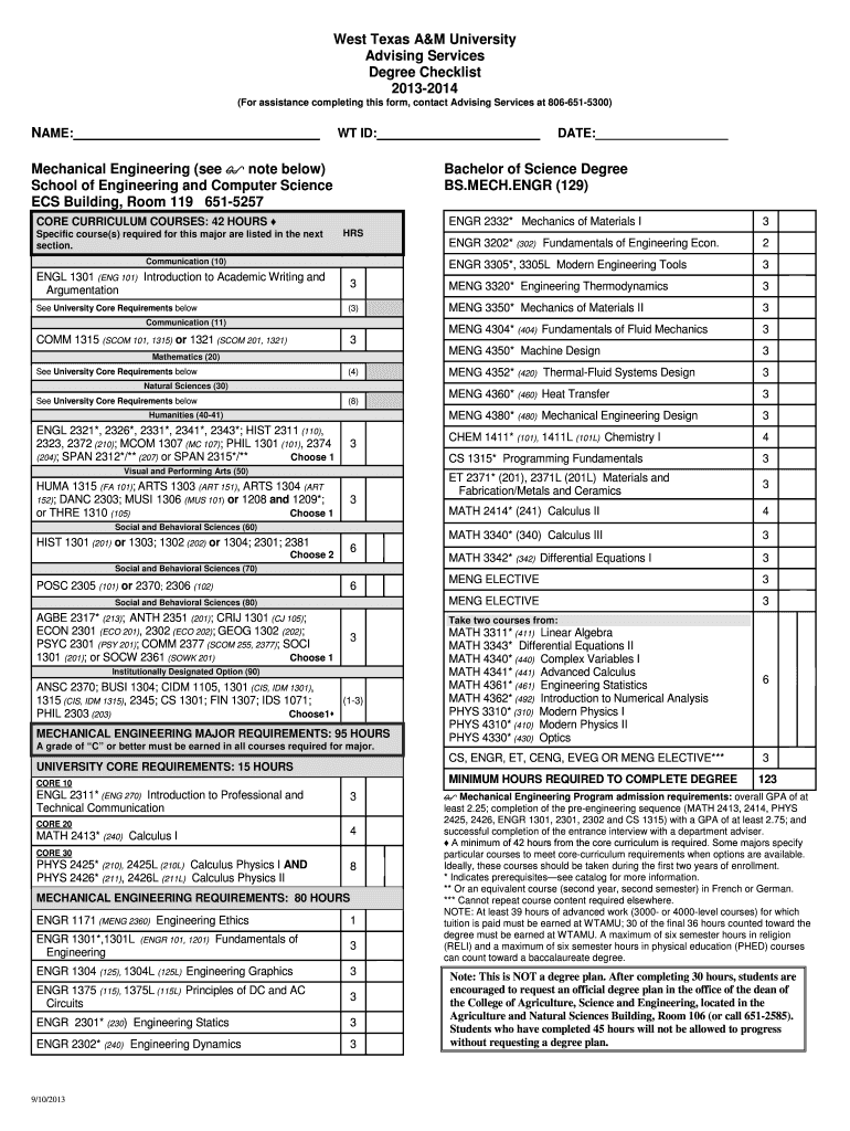 West Texas A&M University Advising Services Degree Checklist 20132014 (For assistance completing this form, contact Advising Services at 8066515300) NAME: WT ID: Mechanical Engineering (see note below)