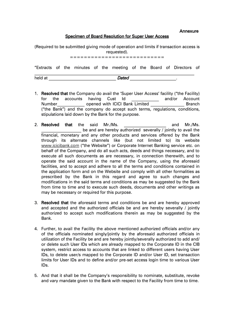 Appendix Specimen of Board Resolution for Super User Access (Required to be submitted giving mode of operation and limits if transaction access is requested). Extracts of the minutes of the meeting