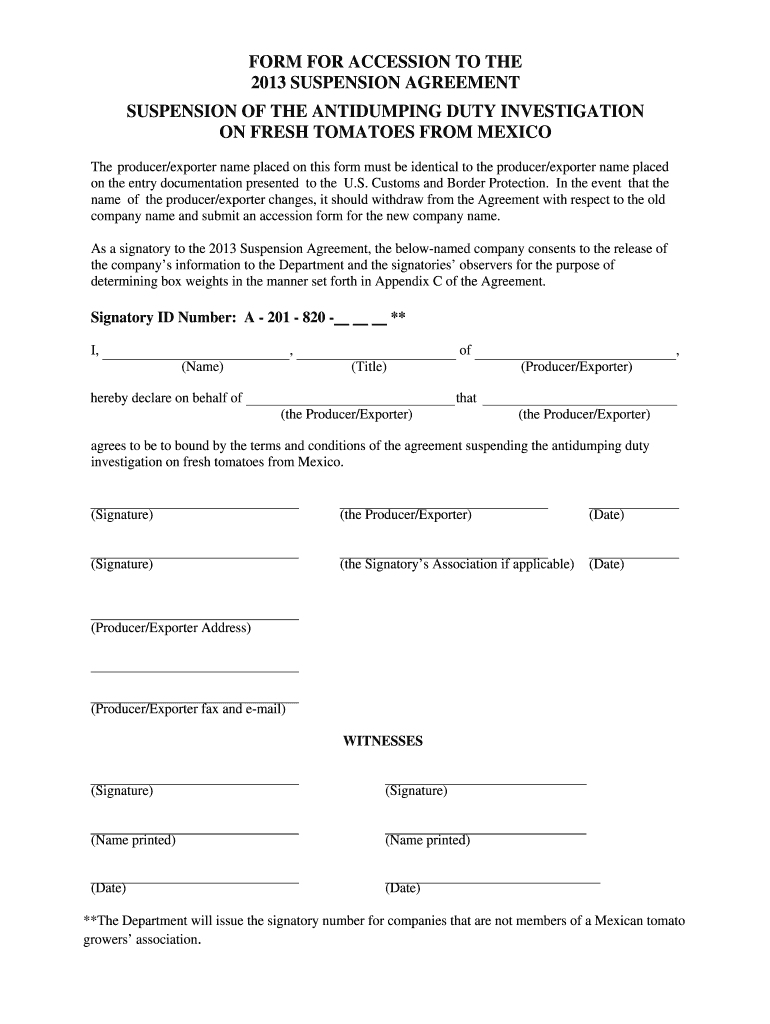 FORM FOR ACCESSION TO THE 2013 SUSPENSION AGREEMENT SUSPENSION OF THE ANTIQUING DUTY INVESTIGATION ON FRESH TOMATOES FROM MEXICO The producer/exporter name placed on this form must be identical to