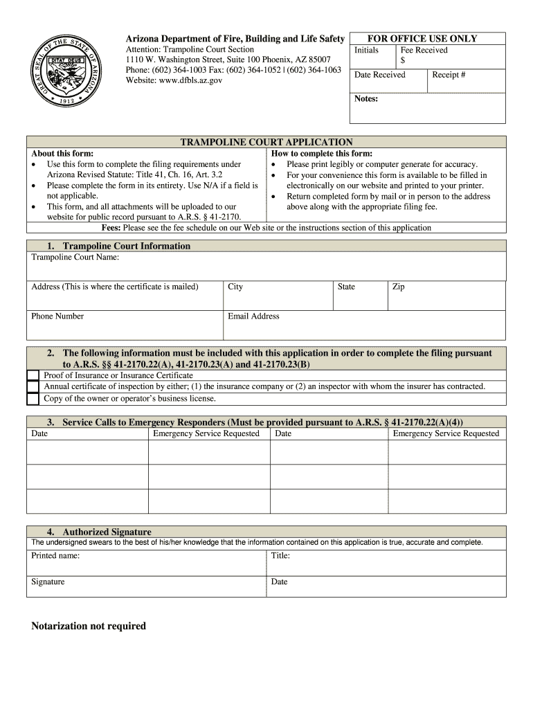 Arizona Department of Fire, Building and Life Safety Attention: Trampoline Court Section 1110 W. Washington Street, Suite 100 Phoenix, AZ 85007 Phone: (602) 3641003 Fax: (602) 3641052 (602) 3641063