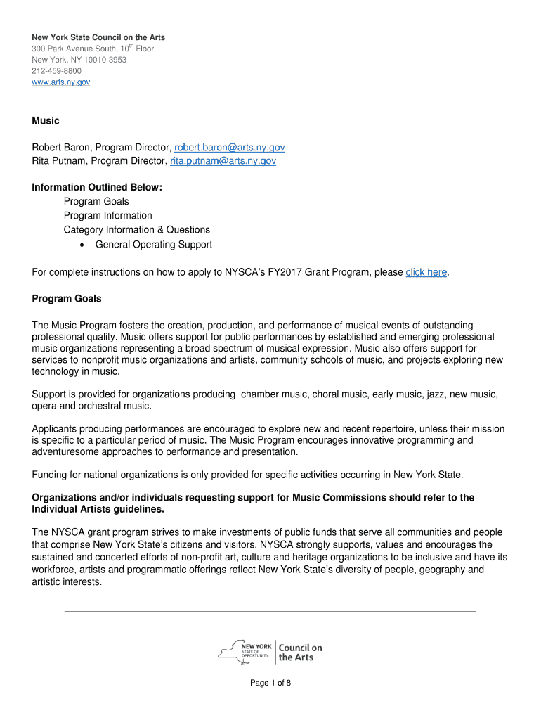 New York State Council on the Arts TH 300 Park Avenue South, 10 Floor New York, NY 100103953 2124598800 www.arts.ny.govMusic Robert Baron, Program Director, Robert. Baron arts.NY.gov Rita Putnam,