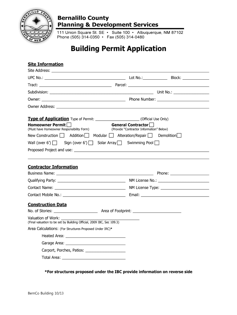 BERNALILLO COUNTY Planning & Development Services 111 Union Square SE, Suite 100 Albuquerque, NM 87102 (505) 3140350 Fax: (505) 3140480 www.bernco.gov COMMERCIAL BUILDING PACKET This packet contains: