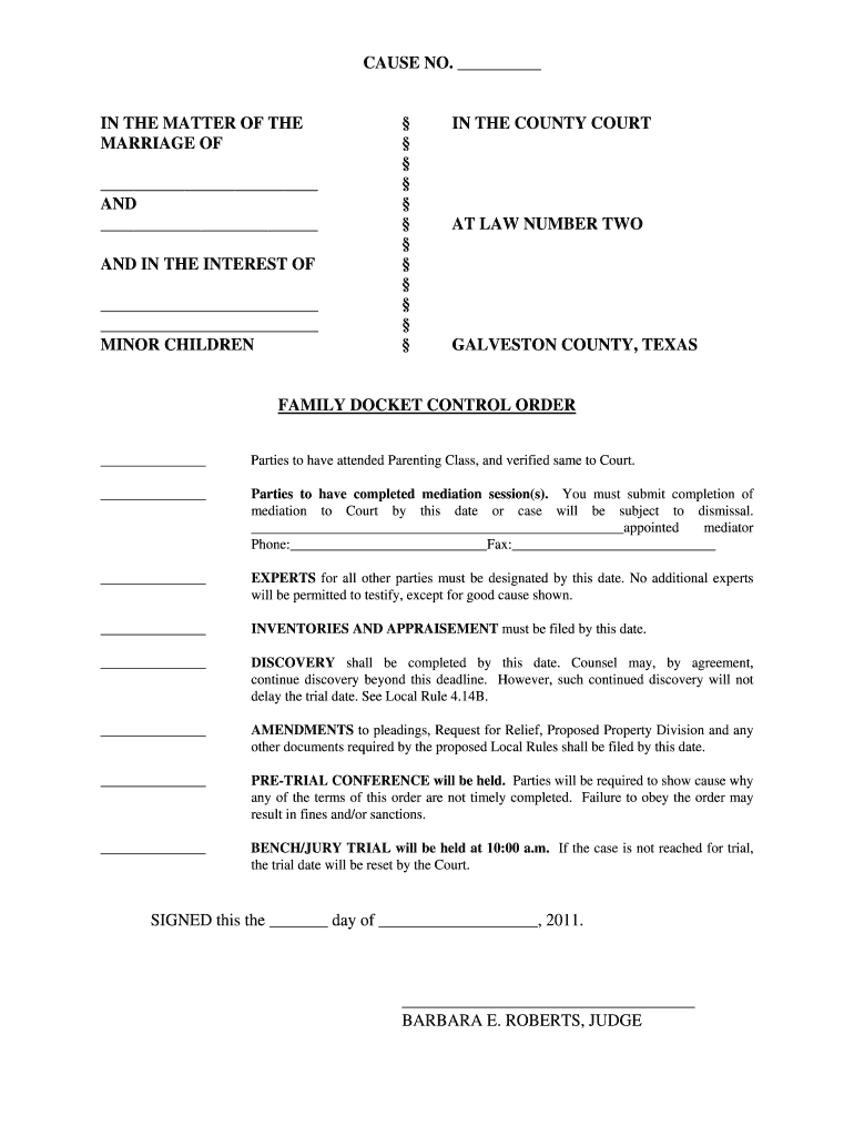 CAUSE NO. IN THE MATTER OF THE MARRIAGE OF AND IN THE INTEREST OF MINOR CHILDREN IN THE COUNTY COURT AT LAW NUMBER TWO GALVESTON COUNTY, TEXAS FAMILY DOCKET CONTROL ORDER Parties to have attended