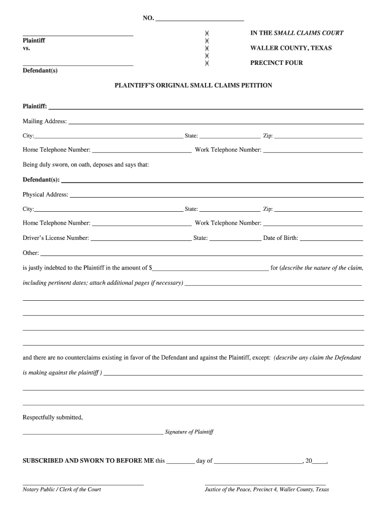 NO. )()()()()(Plaintiff vs. IN THE SMALL CLAIMS COURT WALLER COUNTY, TEXAS PRECINCT FOUR Defendant(s) PLAINTIFFS ORIGINAL SMALL CLAIMS PETITION Plaintiff: Mailing Address: City: State: Home Telephone