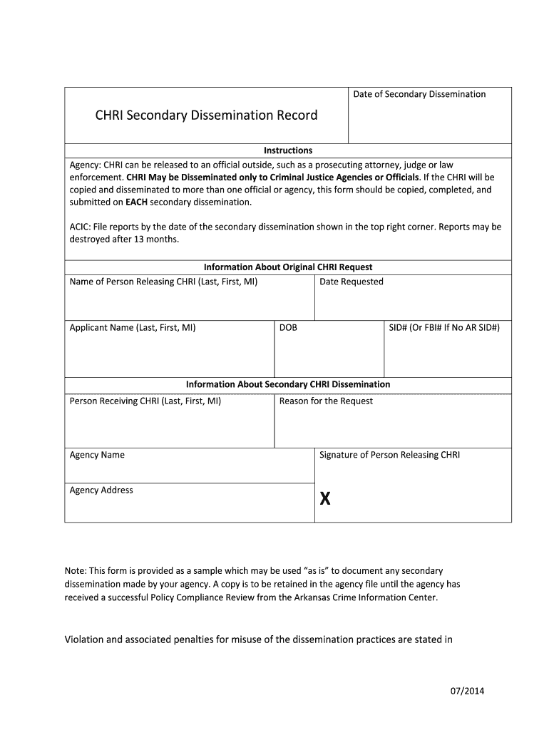 CHRISecondaryDisseminationRecord DateofSecondaryDissemination Instructions Agency:CHRIcanbereleasedtoanofficialoutside, suchasaprosecutingattorney, Jude Law enforcement.CHRIMaybeDisseminatedonlytoCriminalJusticeAgenciesorOfficials.