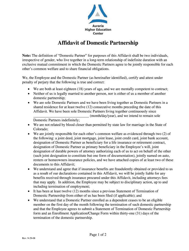 Note: The definition of Domestic Partner for purposes of this Affidavit shall be two individuals,