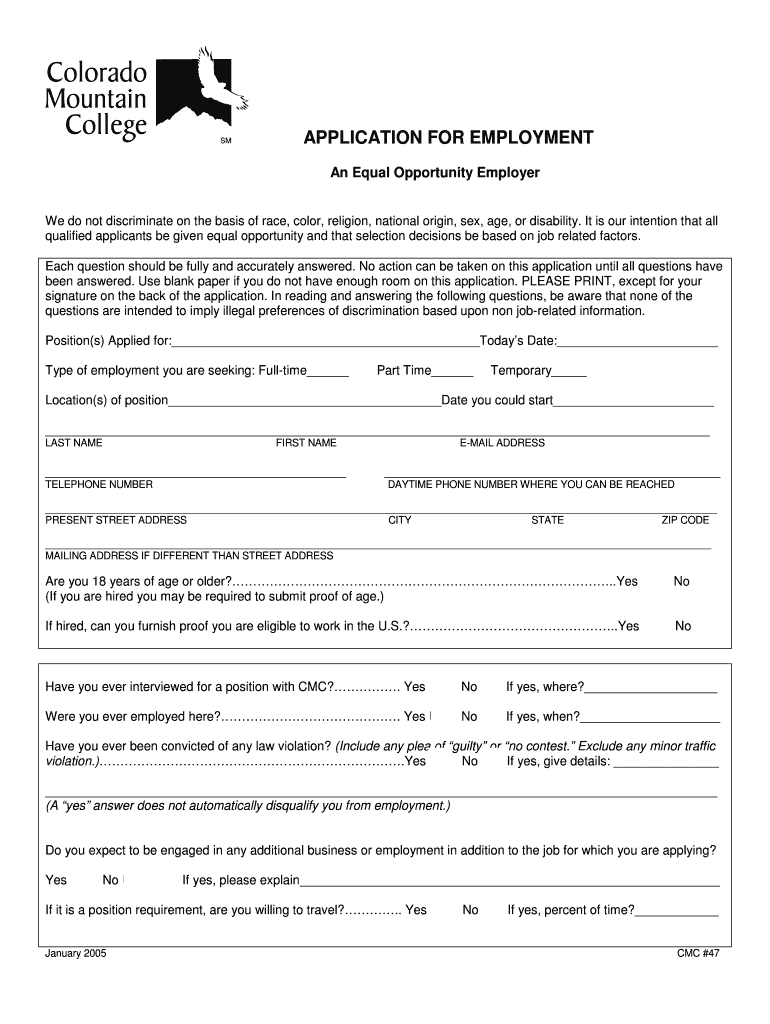 Get the free APPLICATION FOR EMPLOYMENT - mycmccoloradomtnedu - mycmc coloradomtn