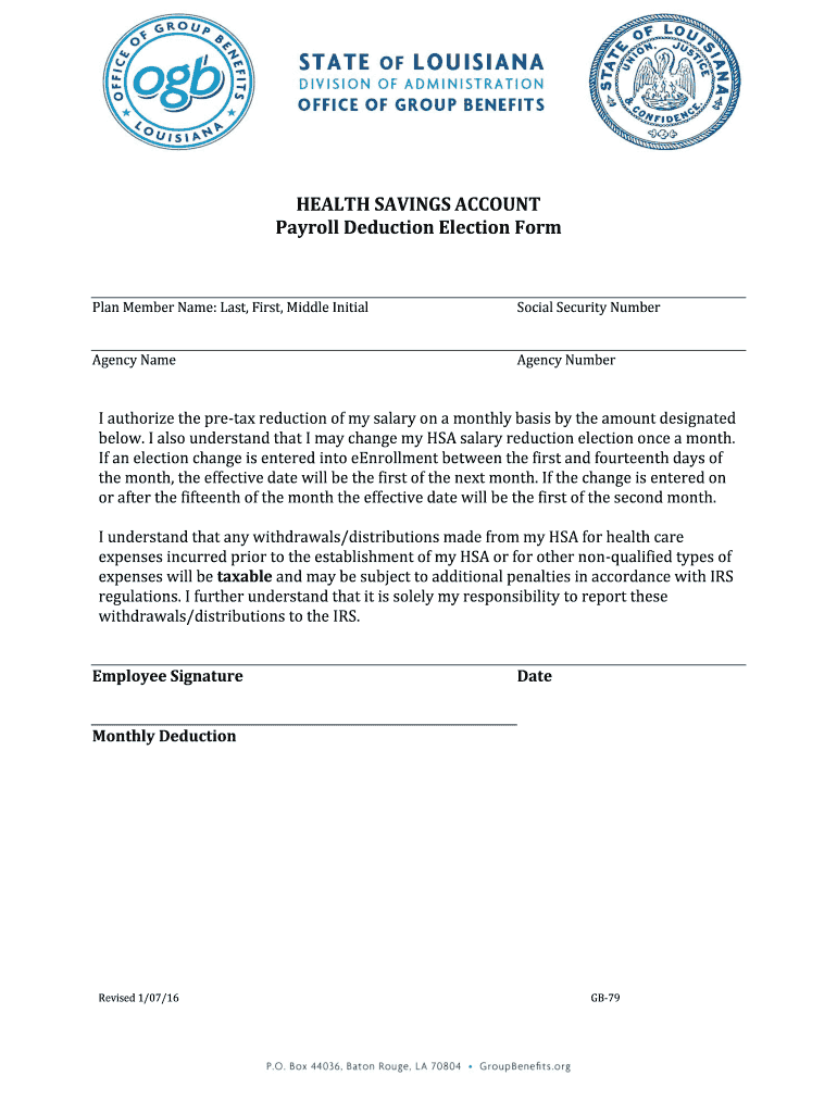 HEALTH SAVINGS ACCOUNT Payroll Deduction Election Form Plan Member Name: Last, First, Middle Initial Social Security Number Agency Name Agency Number I authorize the pretax reduction of my salary