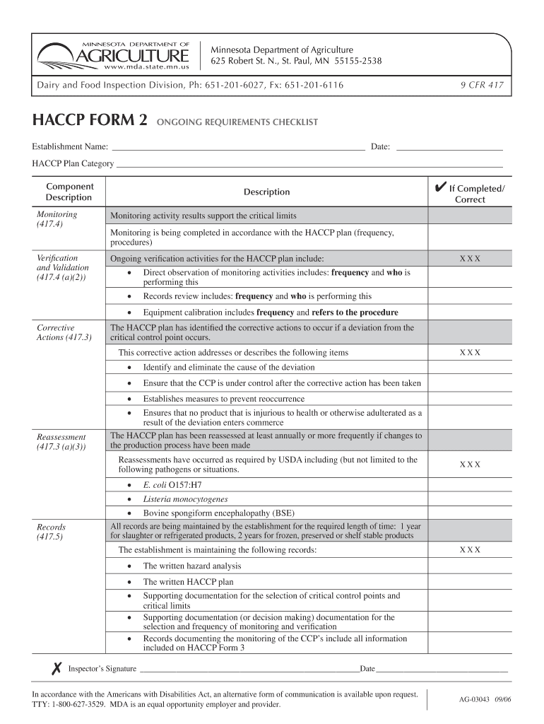 Dairy and Food Inspection Division, pH: 6512016027, FX: 6512016116 HACCP FORM 2 9 CFR 417 ONGOING REQUIREMENTS CHECKLIST Establishment Name: Date: HACCP Plan Category Component Description Monitoring