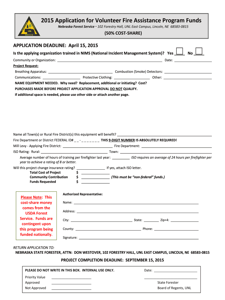 2015 Application for Volunteer Fire Assistance Program Funds Nebraska Forest Service 102 Forestry Hall, UNL East Campus, Lincoln, NE 685830815 (50% COSTAR) APPLICATION DEADLINE: April 15, 2015, Is