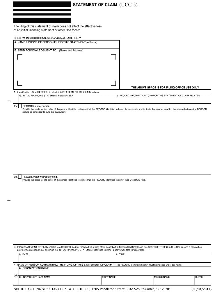 STATEMENT OF CLAIM (UCC5) The filing of this statement of claim does not affect the effectiveness of an initial financing statement or other filed record. FOLLOW INSTRUCTIONS (front and back) CAREFULLY