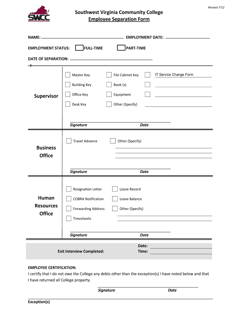 Revised 7/12 Southwest Virginia Community College Employee Separation Form NAME: EMPLOYMENT DATE: EMPLOYMENT STATUS: FULL TIME PART TIME DATE OF SEPARATION: Master Key Building Key Office Key Equipment