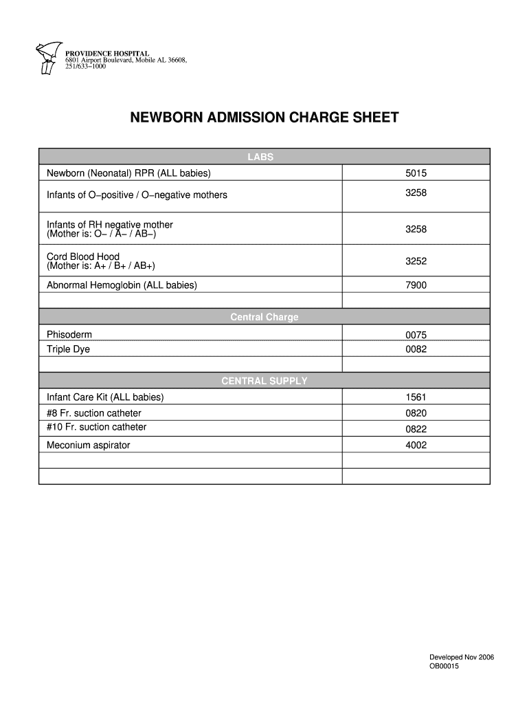 PROVIDENCE HOSPITAL 6801 Airport Boulevard, Mobile AL 36608, 251/6331000 NEWBORN ADMISSION CHARGE SHEET LABS Newborn (Neonatal) RPR (ALL babies) 5015 Infants of Positive / Negative mothers 3258 Infants