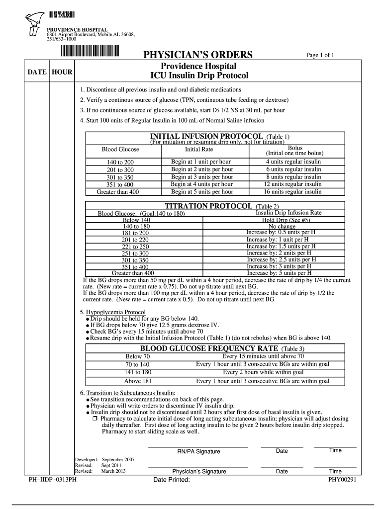 An r×PO104×r BC PROVIDENCE HOSPITAL 6801 Airport Boulevard, Mobile AL 36608, 251/6331000 DATE HOUR PHYSICIANS ORDERS Page 1 of 1 Providence Hospital ICU Insulin Drip Protocol 1. Discontinue all