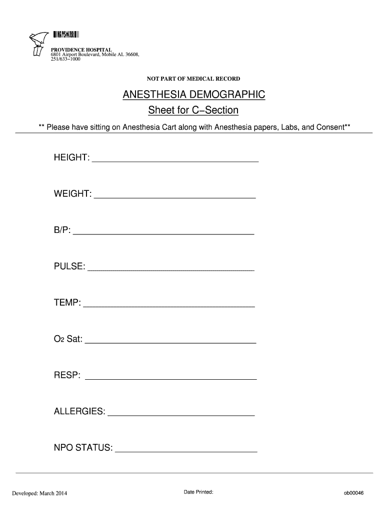 A BC PROVIDENCE HOSPITAL 6801 Airport Boulevard, Mobile AL 36608, 251/6331000 NOT PART OF MEDICAL RECORD ANESTHESIA DEMOGRAPHIC Sheet for Section ** Please have sitting on Anesthesia Cart along with