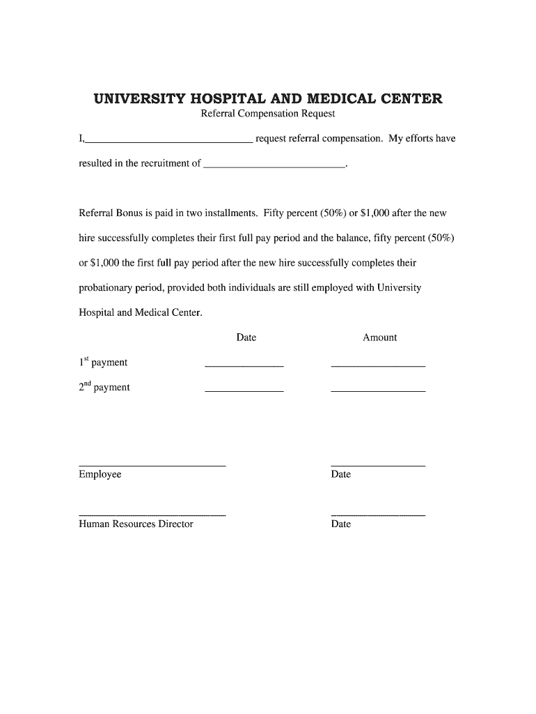 UNIVERSITY HOSPITAL AND MEDICAL CENTER Referral Compensation Request I, request referral compensation. My efforts have resulted in the recruitment of. Referral Bonus is paid in two installments. Fifty