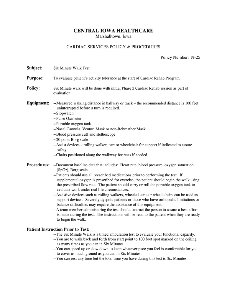 CENTRAL IOWA HEALTHCARE Marshalltown, Iowa CARDIAC SERVICES POLICY & PROCEDURES Policy Number: N25 Subject: Six Minute Walk Test Purpose: To evaluate patients activity tolerance at the start of Cardiac