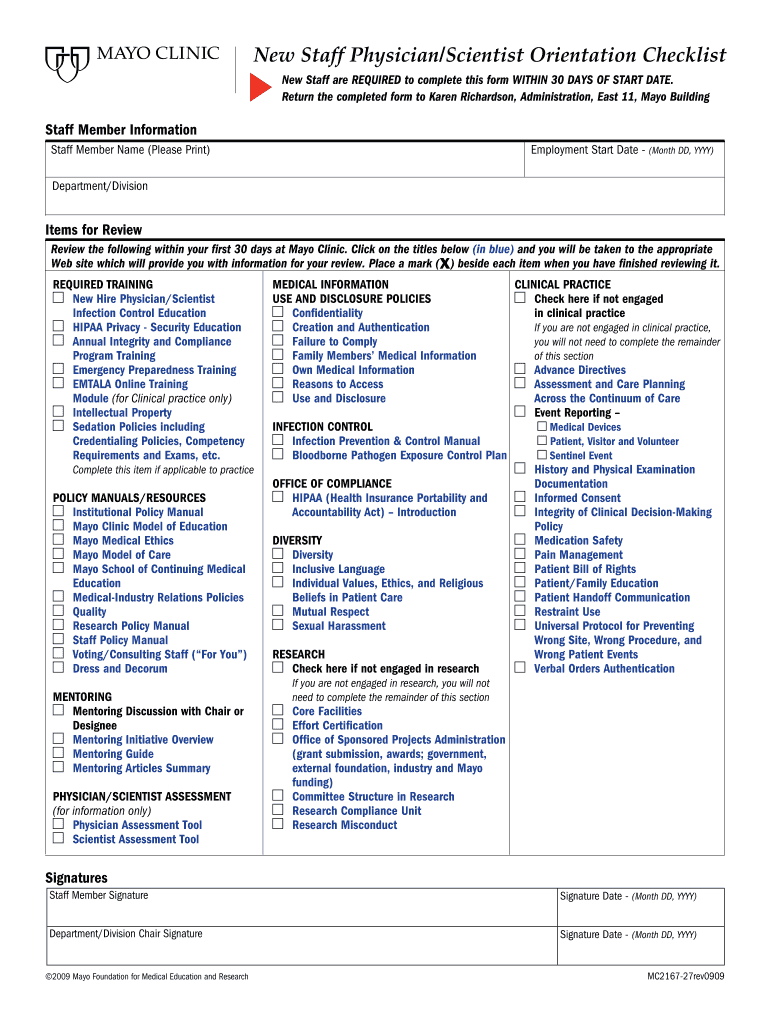 Get the free New Staff PhysicianScientist Orientation - MC2167-27 New Staff PhysicianScientist Or...
