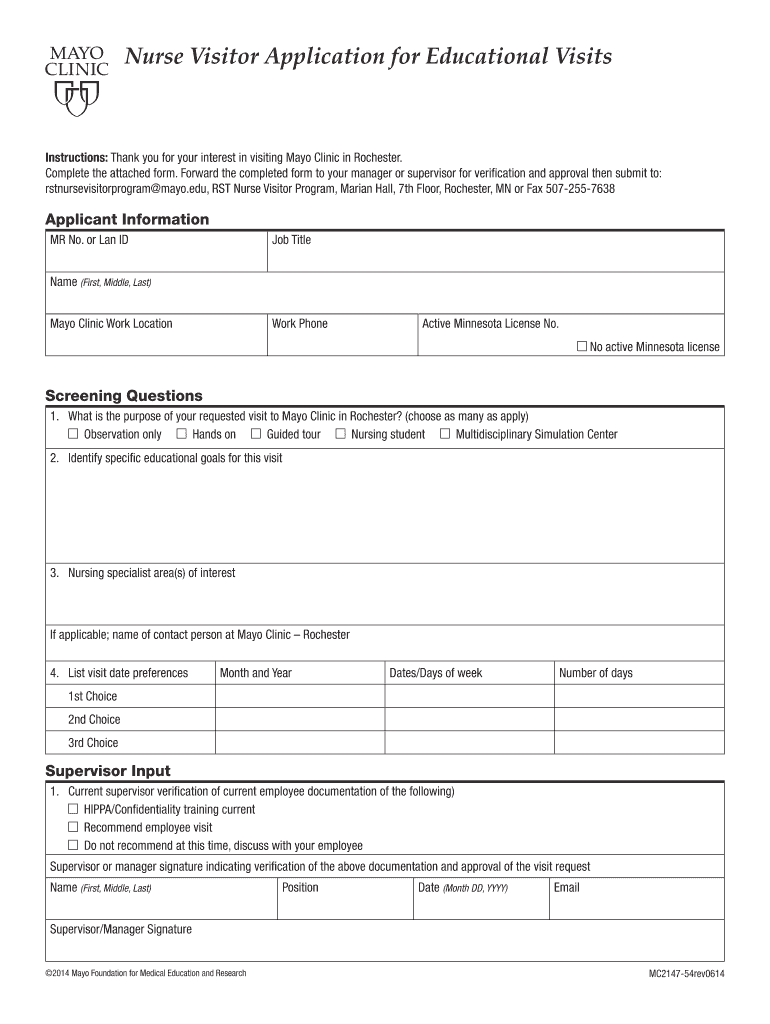 Complete, print and submit Reset Form Nurse Visitor Application for Educational Visits Instructions: Thank you for your interest in visiting Mayo Clinic in Rochester. Complete the attached form. Forward