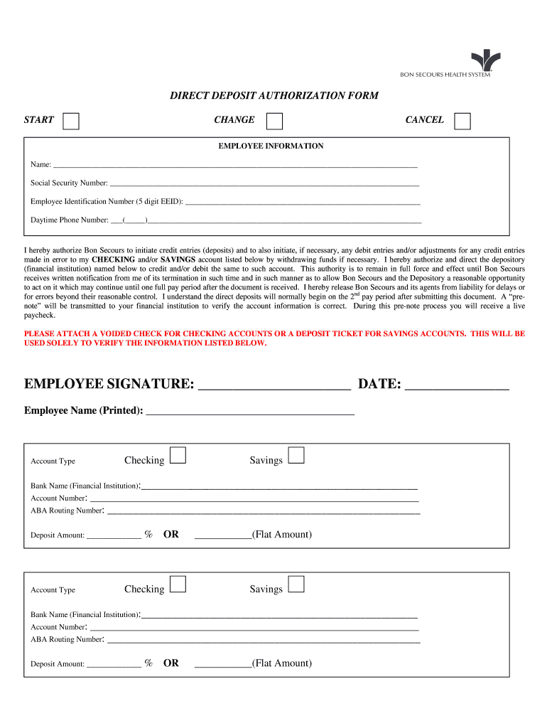 Get the free DIRECT DEPOSIT AUTHORIZATION FORM - Bon Secours