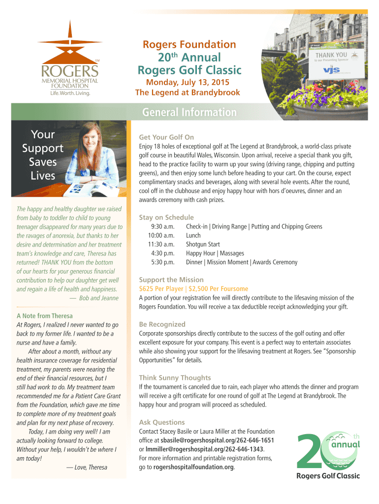 Rogers Foundation 20th Annual Rogers Golf Classic Monday, July 13, 2015, The Legend at Brandy brook General Information Your Support Saves Lives The happy and healthy daughter we raised from baby