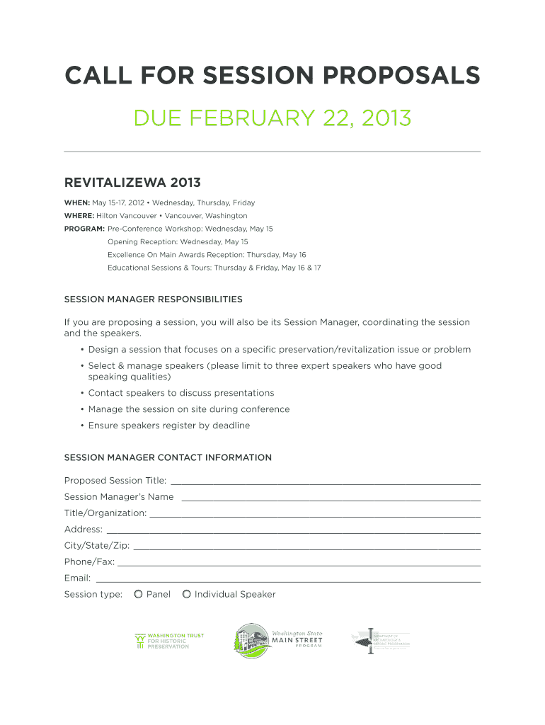 CALL FOR SESSION PROPOSALS DUE FEBRUARY 22, 2013, REVITALIZE WA 2013 WHEN: May 1517, 2012 Wednesday, Thursday, Friday WHERE: Hilton Vancouver, Washington PROGRAM: Conference Workshop: Wednesday, May