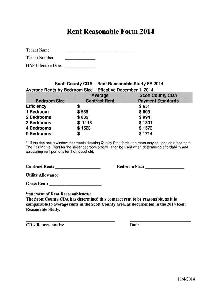 Rent Reasonable Form 2014 Tenant Name: Tenant Number: HAP Effective Date: Scott County CDA Rent Reasonable Study FY 2014 Average Rents by Bedroom Size Effective December 1, 2014, Average Scott County