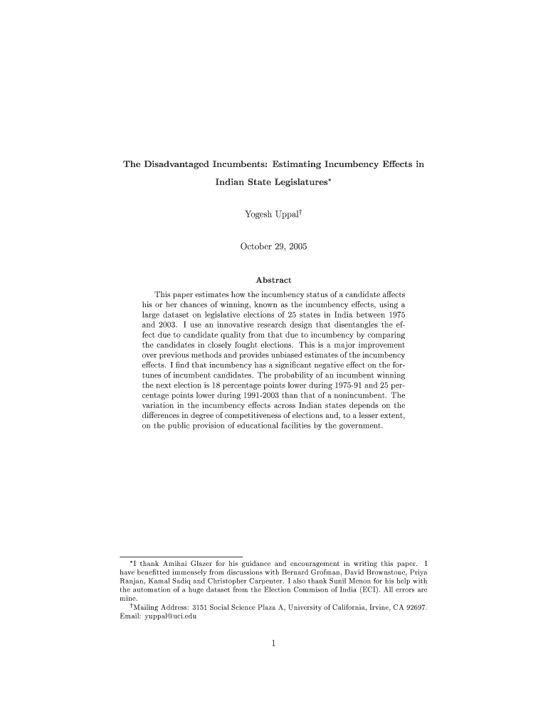This paper estimates the impact of incumbency on election outcomes in India's state legislatures using a dataset of legislative elections from 1975 to 2003, highlighting a significant incumbency disadvantage.