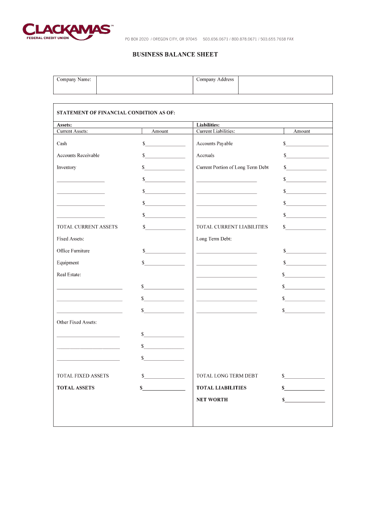 Get the free Business Balance Sheet - Clackamas Federal Credit Union