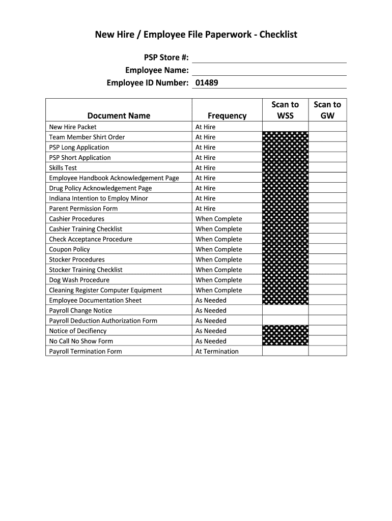 New Hire / Employee File Paperwork Checklist PSP Store #: Employee Name: Employee ID Number: 01489 Document Name New Hire Packet Team Member Shirt Order PSP Long Application PSP Short Application