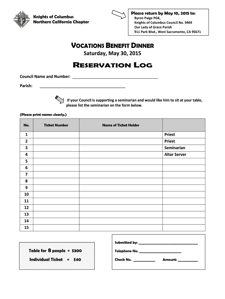 Please return by May 10, 2015, to: Knights of Columbus Northern California Chapter Byron Paige PKK, Knights of Columbus Council No. 9469 Our Lady of Grace Parish 911 Park Blvd., West Sacramento, CA