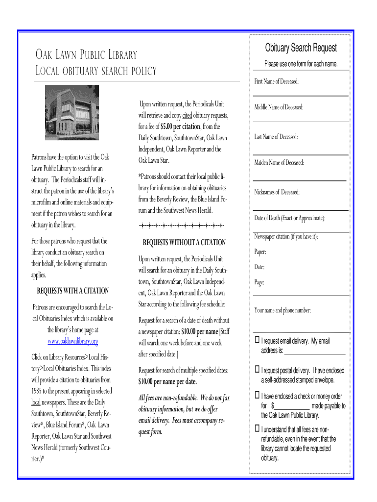 Get the free Obituary Search Request - Oak Lawn Public Library - oaklawnlibrary