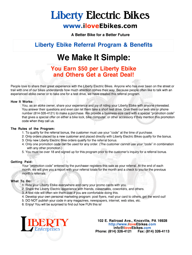 Liberty Electric Bikes www.iloveEbikes.com A Better Bike for a Better Future Liberty Bike Referral Program & Benefits We Make It Simple: You Earn $50 per Liberty Bike and Others Get a Great Deal!
