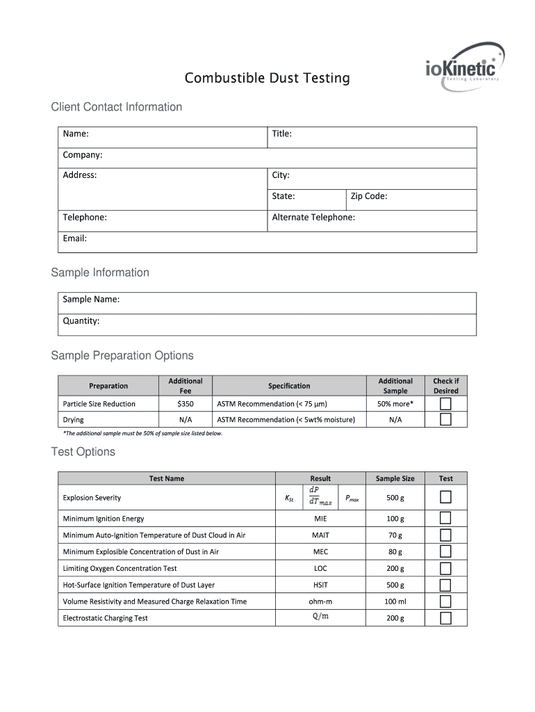 Combustible Dust Testing Client Contact Information Name: Title: Company: Address: City: State: Telephone: Opcode: AlternateTelephone: Email: Sample Information SampleName: Quantity: Sample Preparation