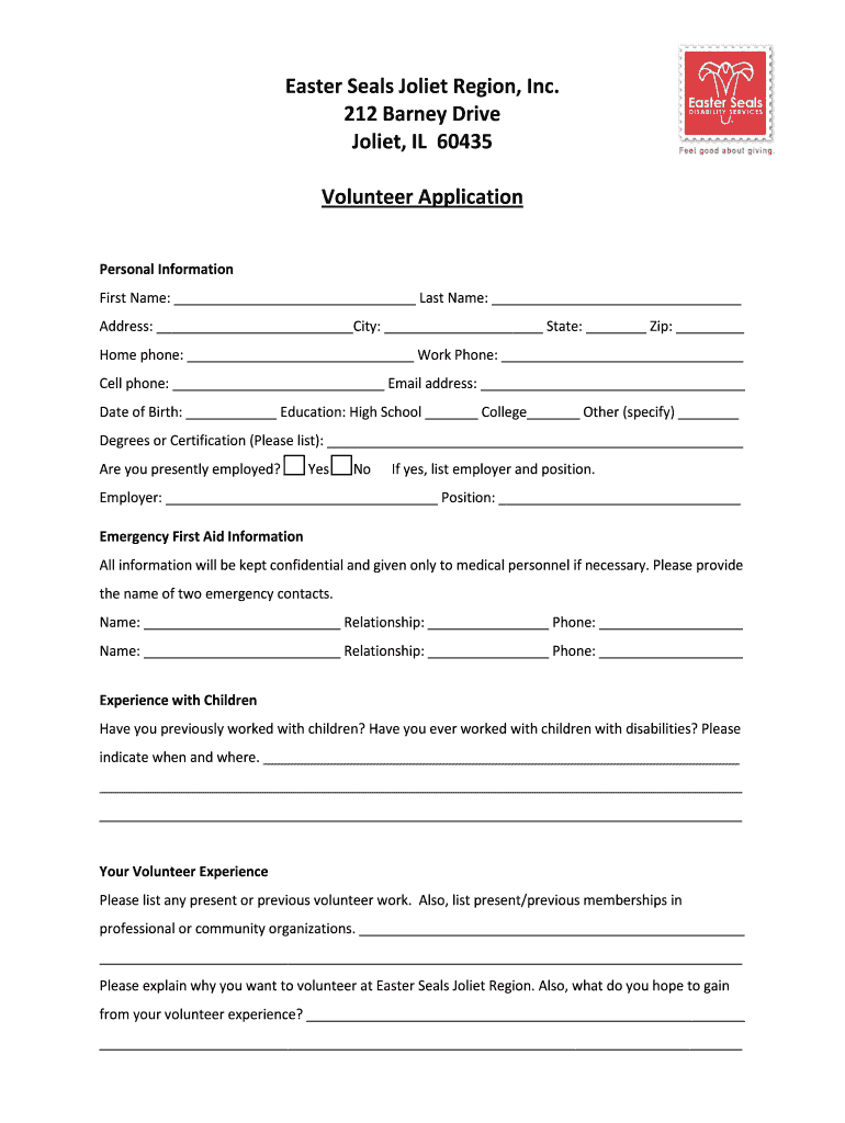 Easter Seals Joliet Region, Inc. 212 Barney Drive Joliet, IL 60435 Volunteer Application Personal Information First Name: Last Name: Address: City: State: Zip: Home phone: Work Phone: Cell phone: