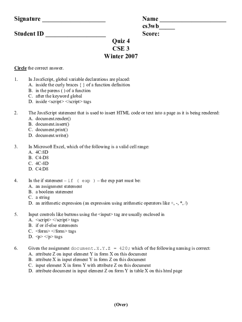 This document is a quiz for the CSE 3 course, covering topics in JavaScript and Microsoft Excel. It includes multiple choice questions and fill-in-the-blank sections.