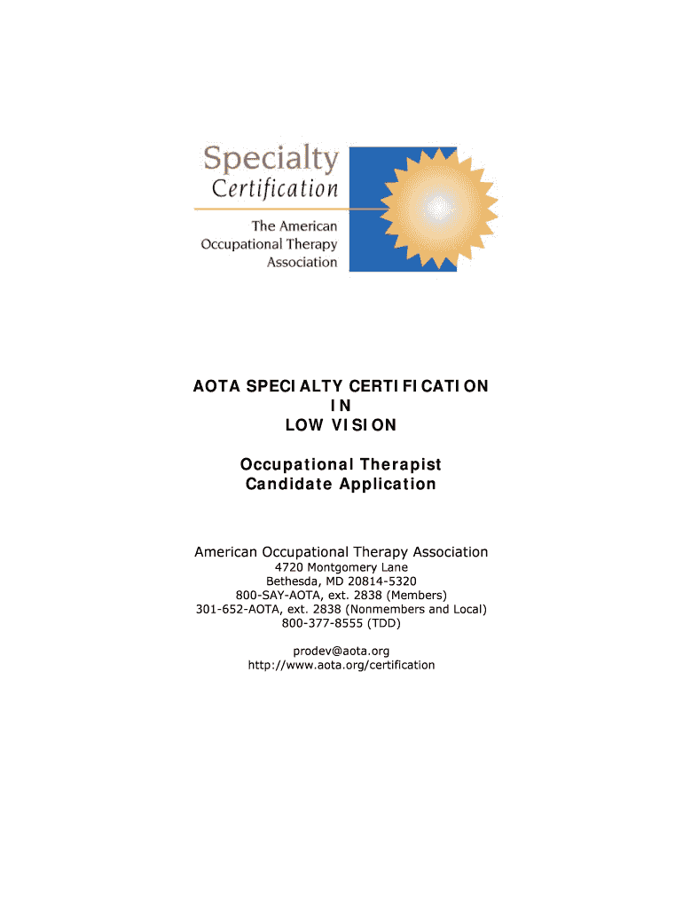 ALTA SPECIALTY CERTIFICATION IN LOW VISION Occupational Therapist Candidate Application American Occupational Therapy Association 4720 Montgomery Lane Bethesda, MD 208145320 800SAYAOTA, ext. 2838