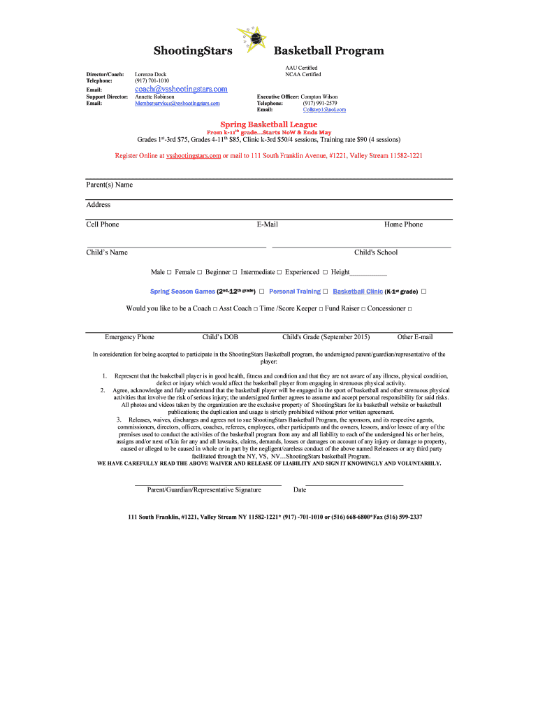 Shooting Stars Basketball Program AAU Certified NCAA Certified Director/Coach: Telephone: Lorenzo Dock (917) 7011010 Email: Support Director: Email: coach vsshootingstars.com Annette Robinson Member